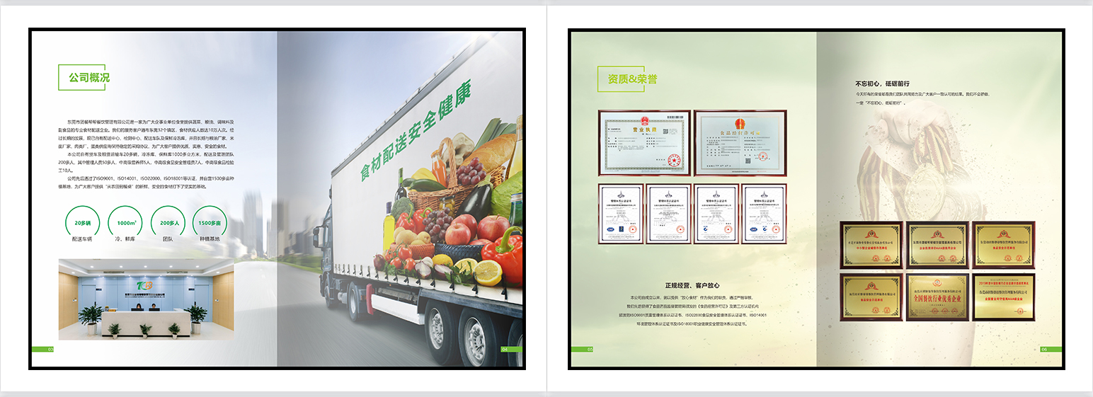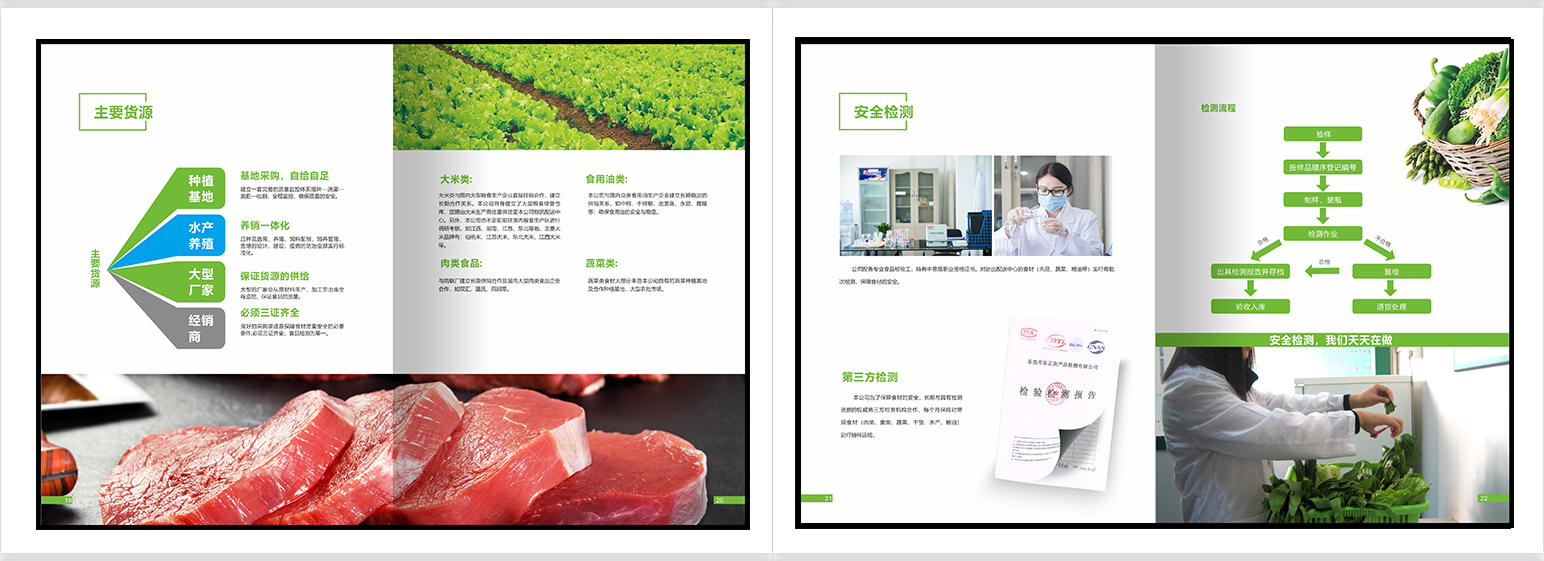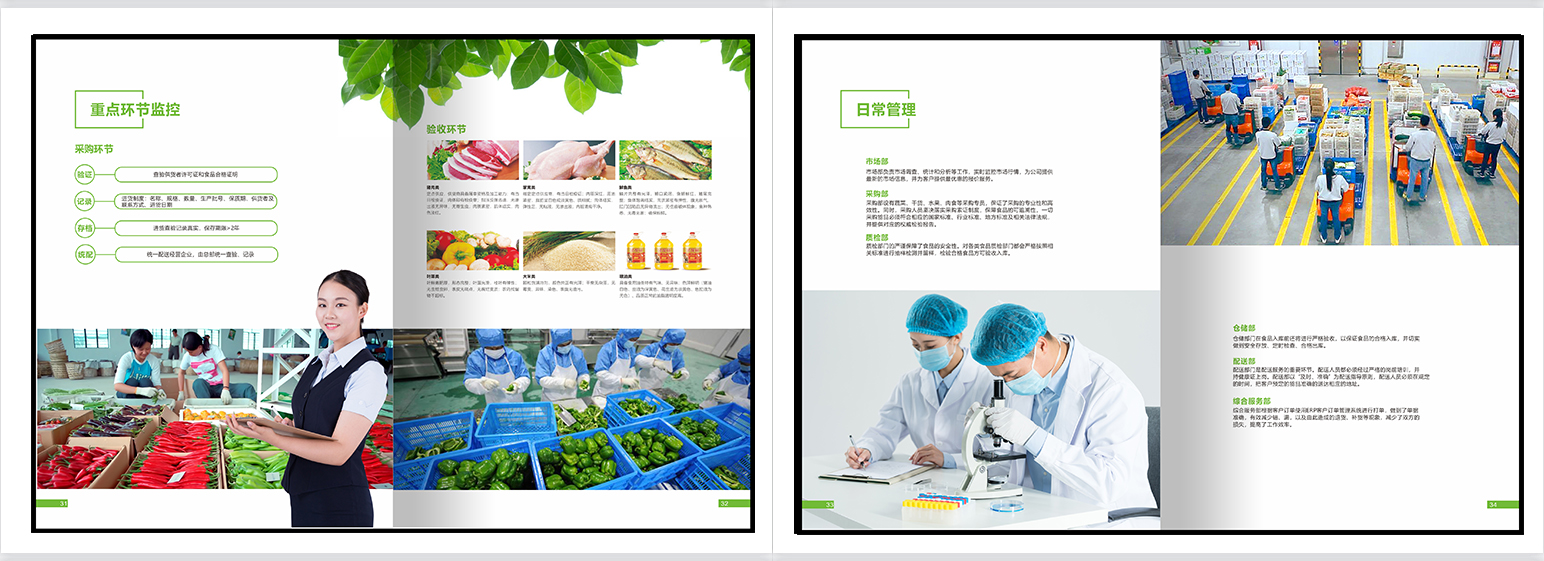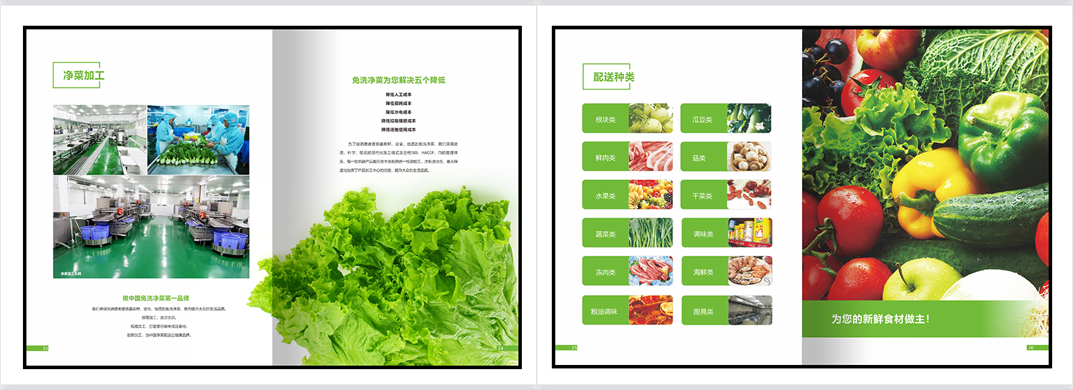 食材配送画册,餐饮画册,团餐画册,团膳画册,绿色册子,食堂承包,配餐模式,种植基地,食品检测,食品安全,净菜加工,配送种类,配送流程,仓库管理,供应商管理,应急管理。