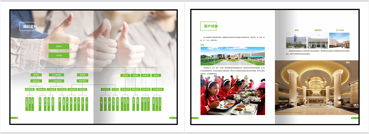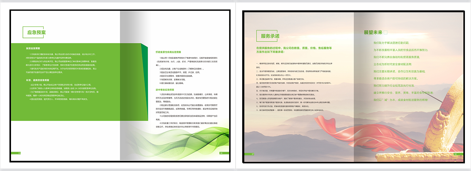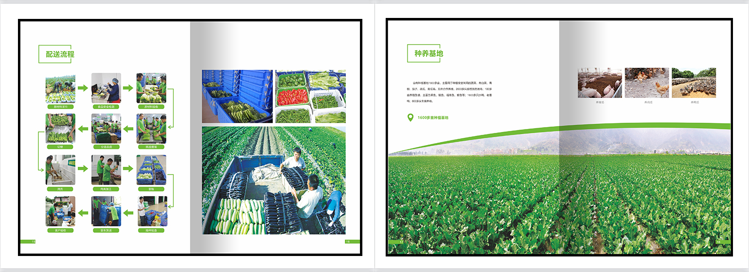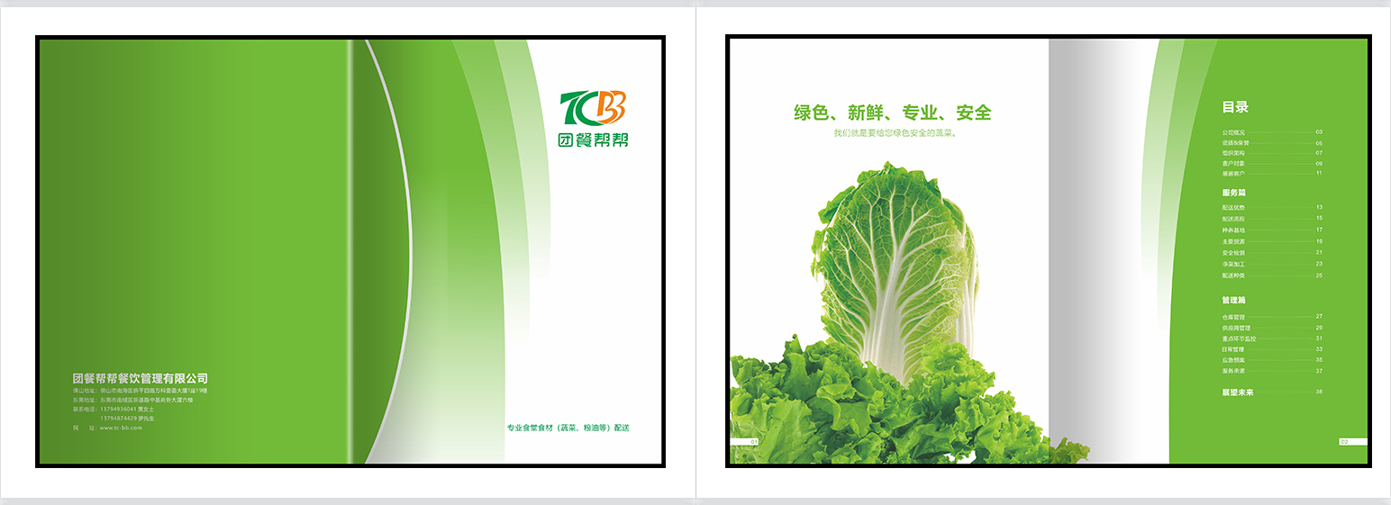 食材配送画册,餐饮画册,团餐画册,团膳画册,绿色册子,食堂承包,配餐模式,种植基地,食品检测,食品安全,净菜加工,配送种类,配送流程,仓库管理,供应商管理,应急管理。